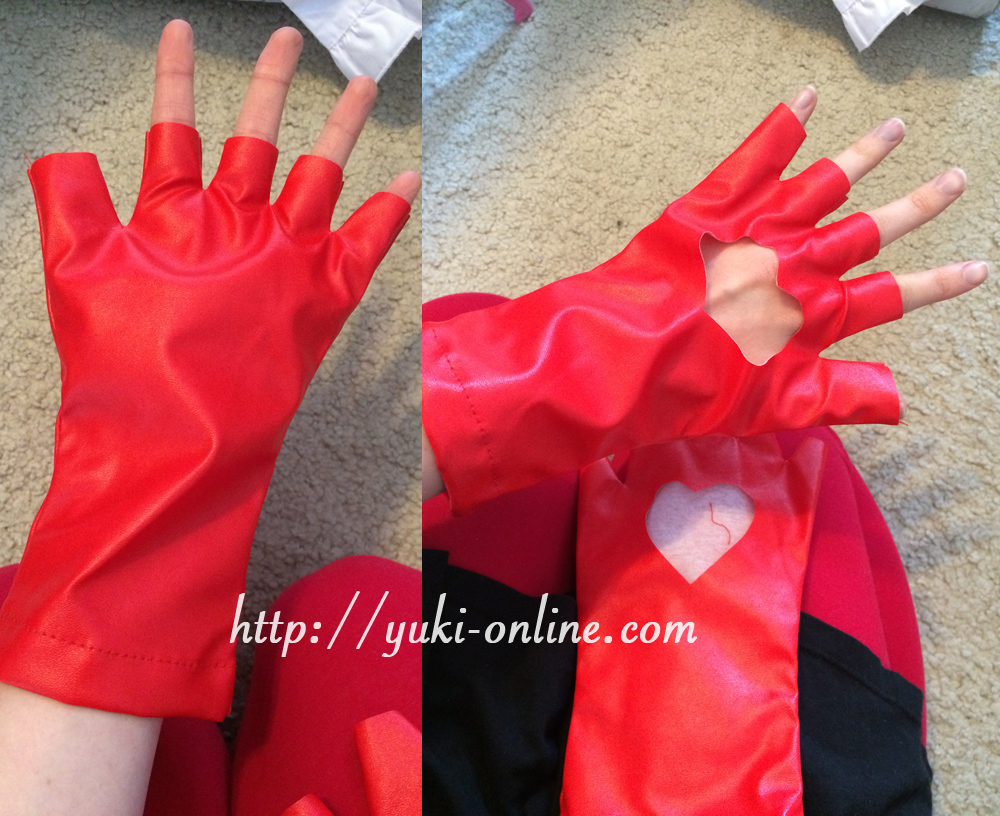 I was looking forward to these but unfortunately they are one of the negatives of this cosplay set. If you look closely at the stock images (seen in Kotori’s below), they are the same way. 🙁 The material is nice and they are comfortable on the inside… But they were cut poorly and do not fit my hands (or my mom’s or my friend’s, for that matter). We will have to either make our own or go without.